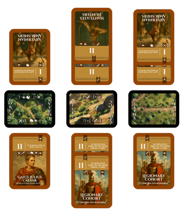 Each player uses a 34-card faction deck (Rome or Gauls).