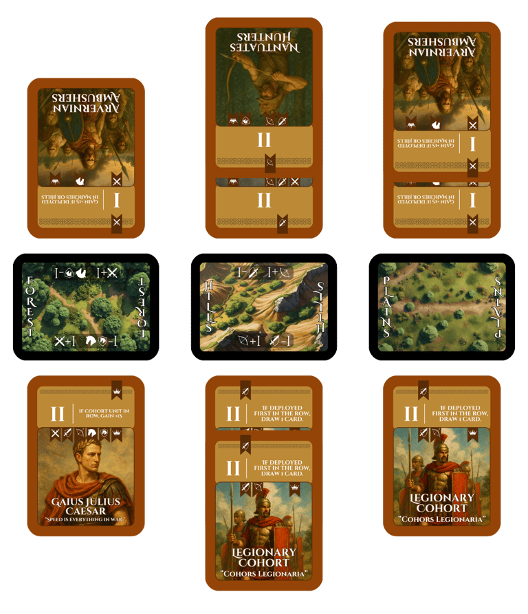 In Battle Tactics: Rome vs Gauls, two players face off in a two-player historical strategy card game set in the Gallic Wars. Deploy units and tactics across three terrains, time your battle initiation, and claim terrain to score Victory Points.